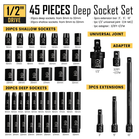 BOENTools 1/2" Dr 45Pc Impact Socket Set Metric