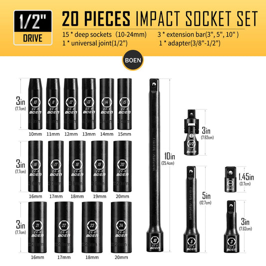 BOENTools 1/2" Dr Impact Metric Socket Set-20Pcs