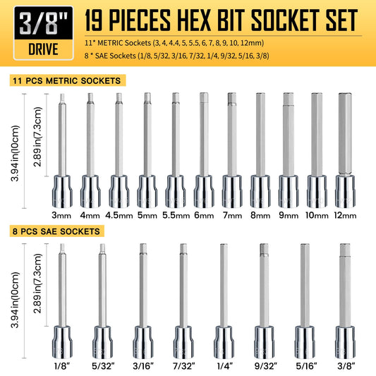 BOEN 19-Piece 3/8 Inch Drive Extra Long Allen Hex Bit Socket Set, Standard SAE (1/8" - 3/8"), Metric (3mm-12mm), CR-V & S2 Alloy Steel, Reliable Mechanic Tool Kit