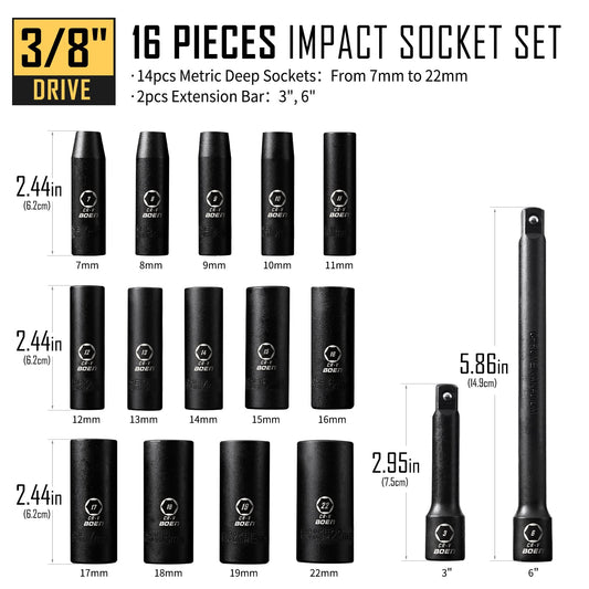 BOENTools 3/8" Dr Deep Impact Socket Set Metric-16Pcs