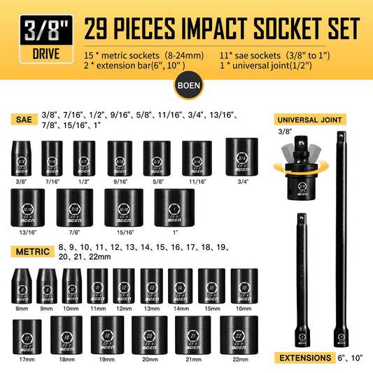 BOENTools 3/8" Dr Shallow Impact Socket Set-29Pcs