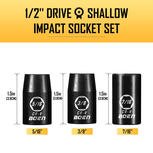 BOEN Tools 1/2" Drive 5/16''3/8''7/16''Inch Shallow SAE Sockets