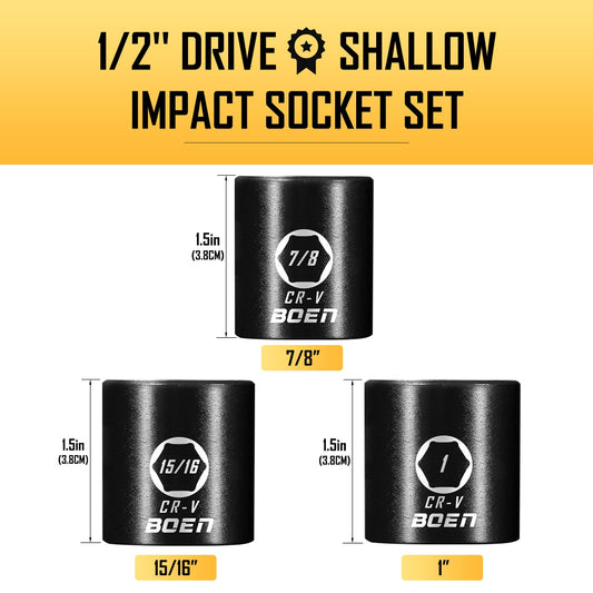 BOEN Tools 1/2" Drive 7/8''15/16''1''Inch Shallow SAE Sockets