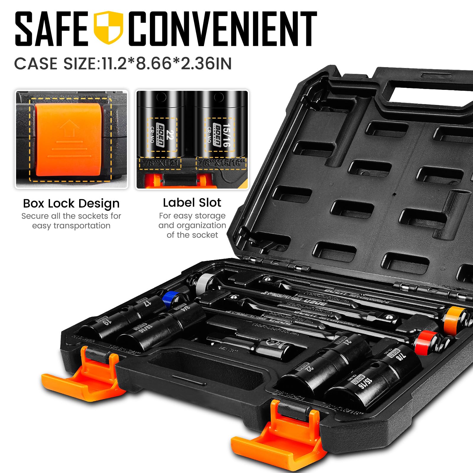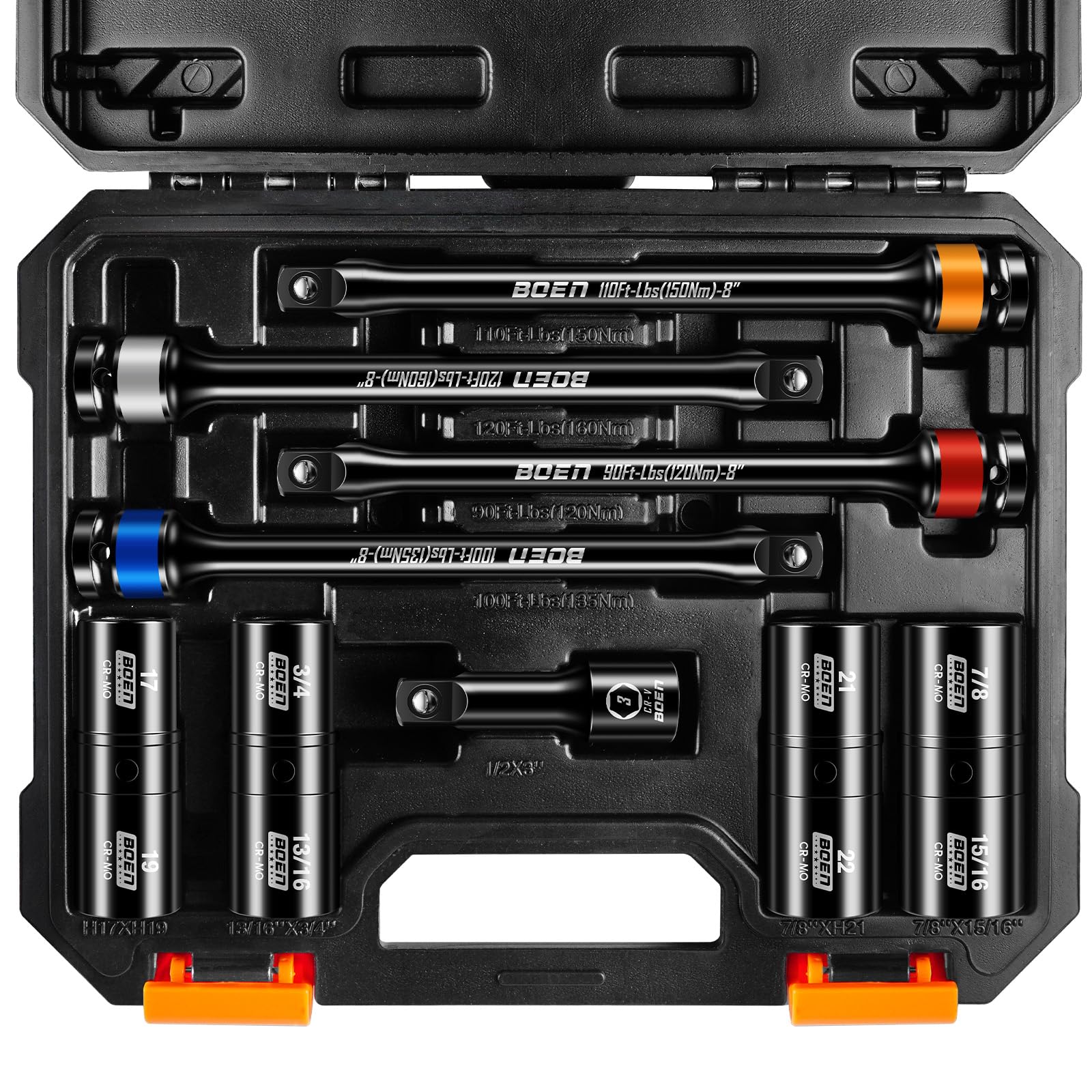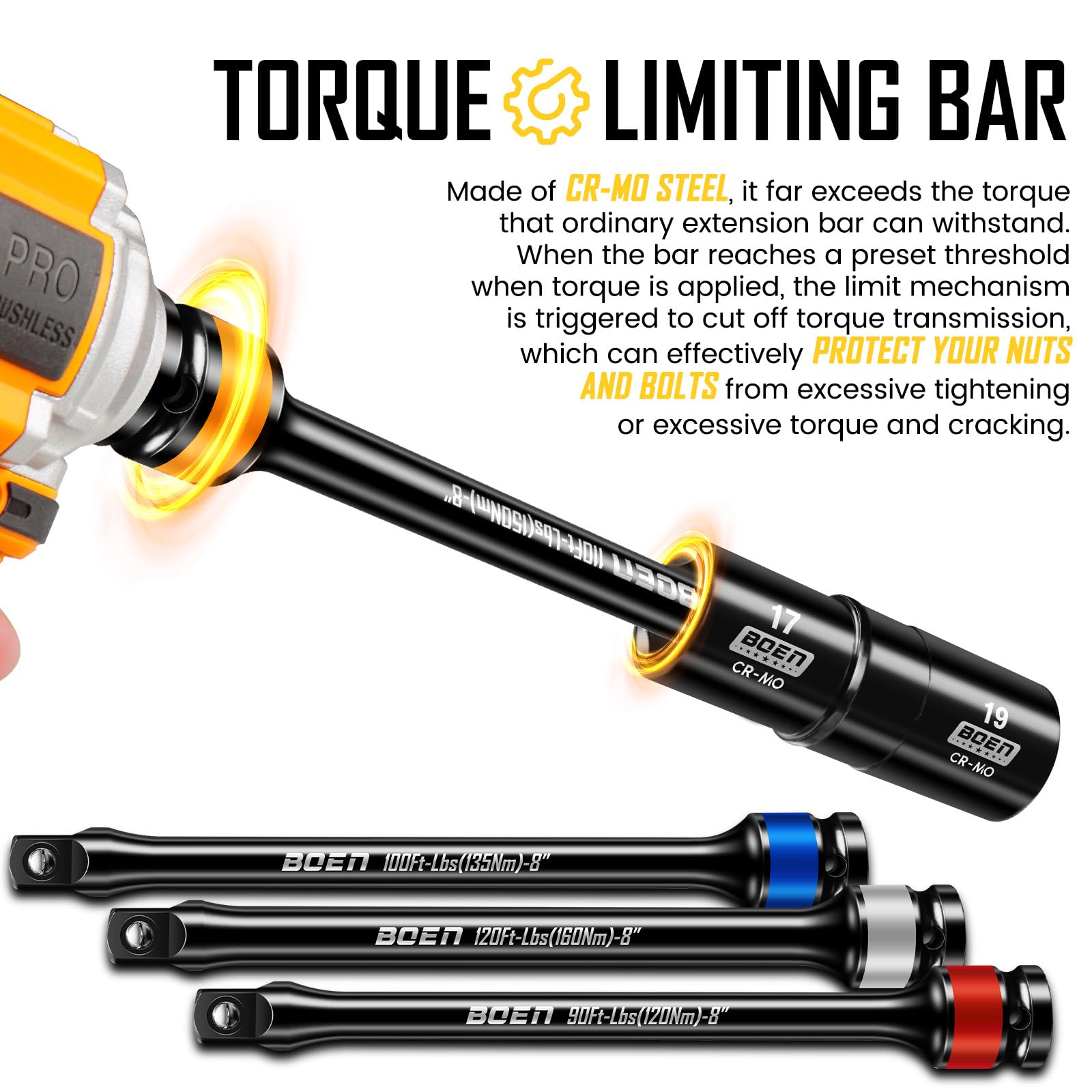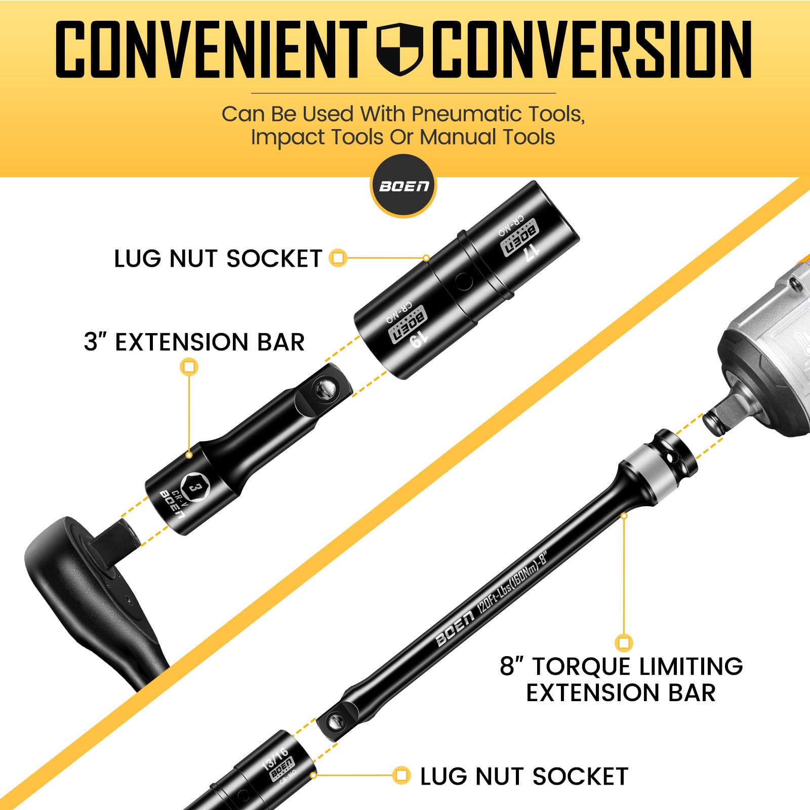 - VERSATILE & COMPLETE SET: boen 9-piece 1/2” drive impact flip lug nut socket and torque limiting extension bar set includes 4pc dual-sided metric/SAE flip sockets (17x19mm, 21x22mm, 3/4x13/16in, 15/16-7/8in), 4pc 8” impact torque limiting extension bars (90/100/110/120 ft/lbs), and a 3" extension bar