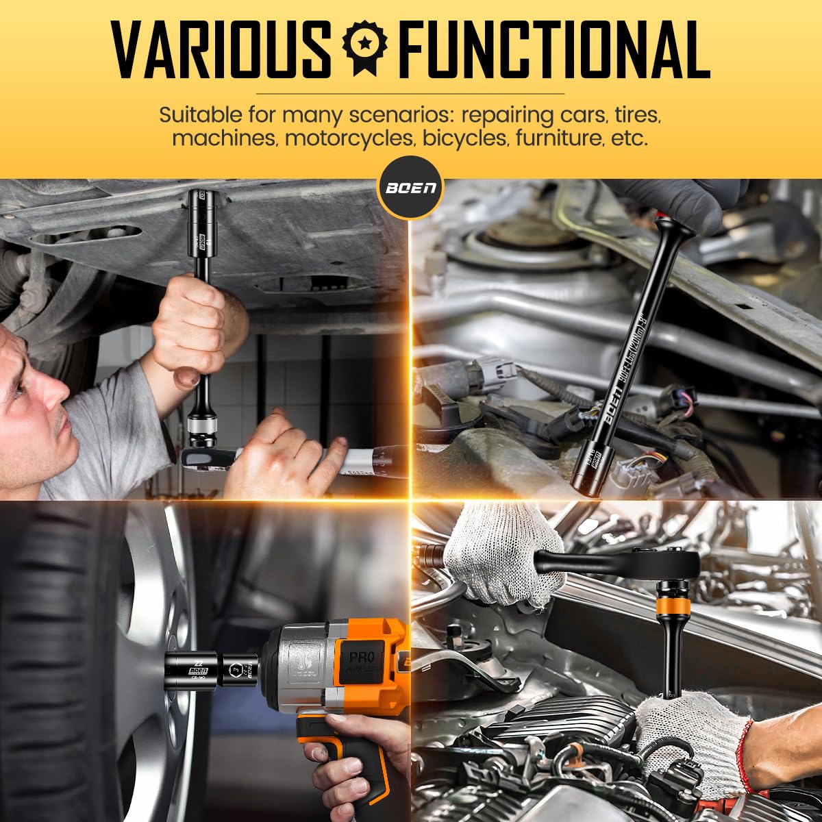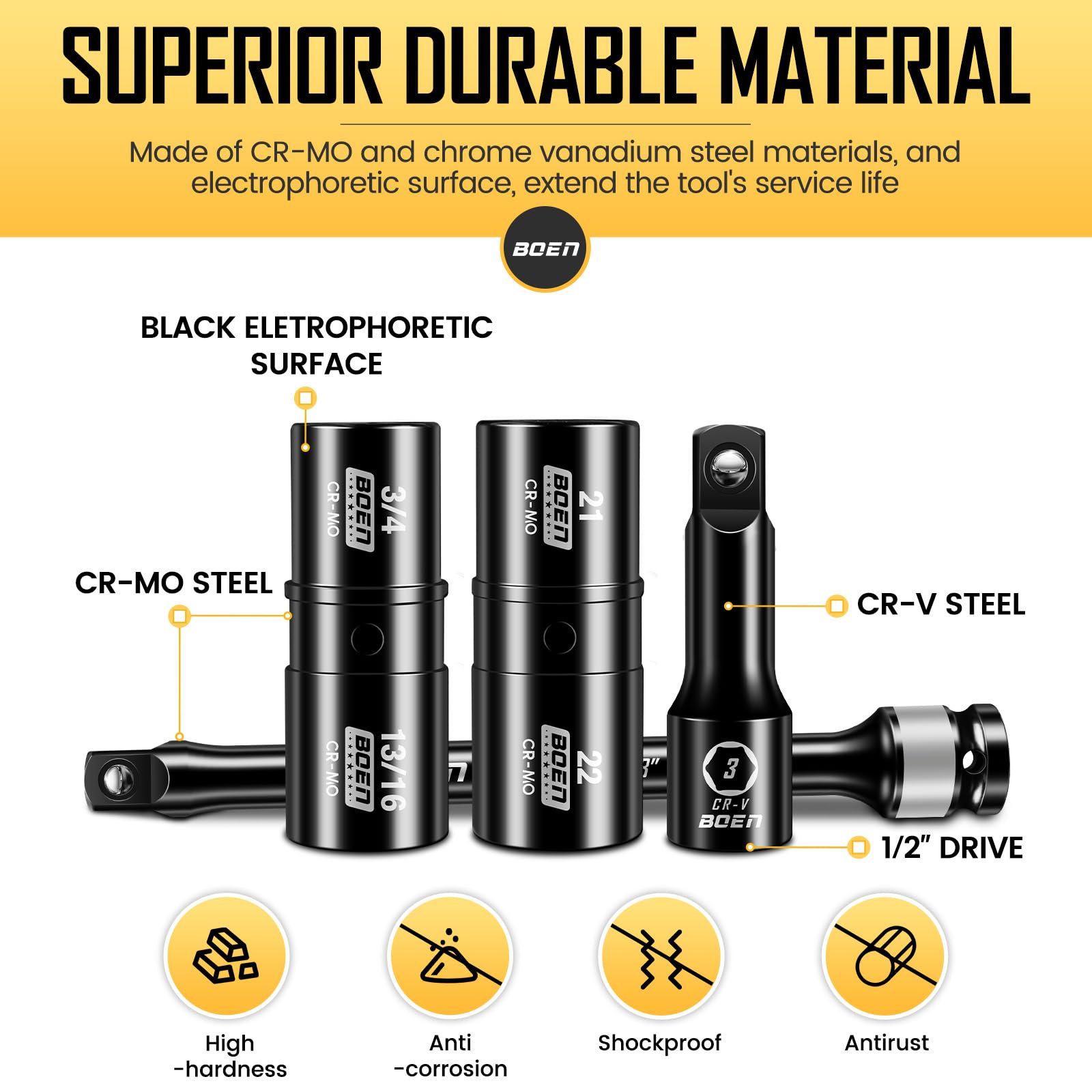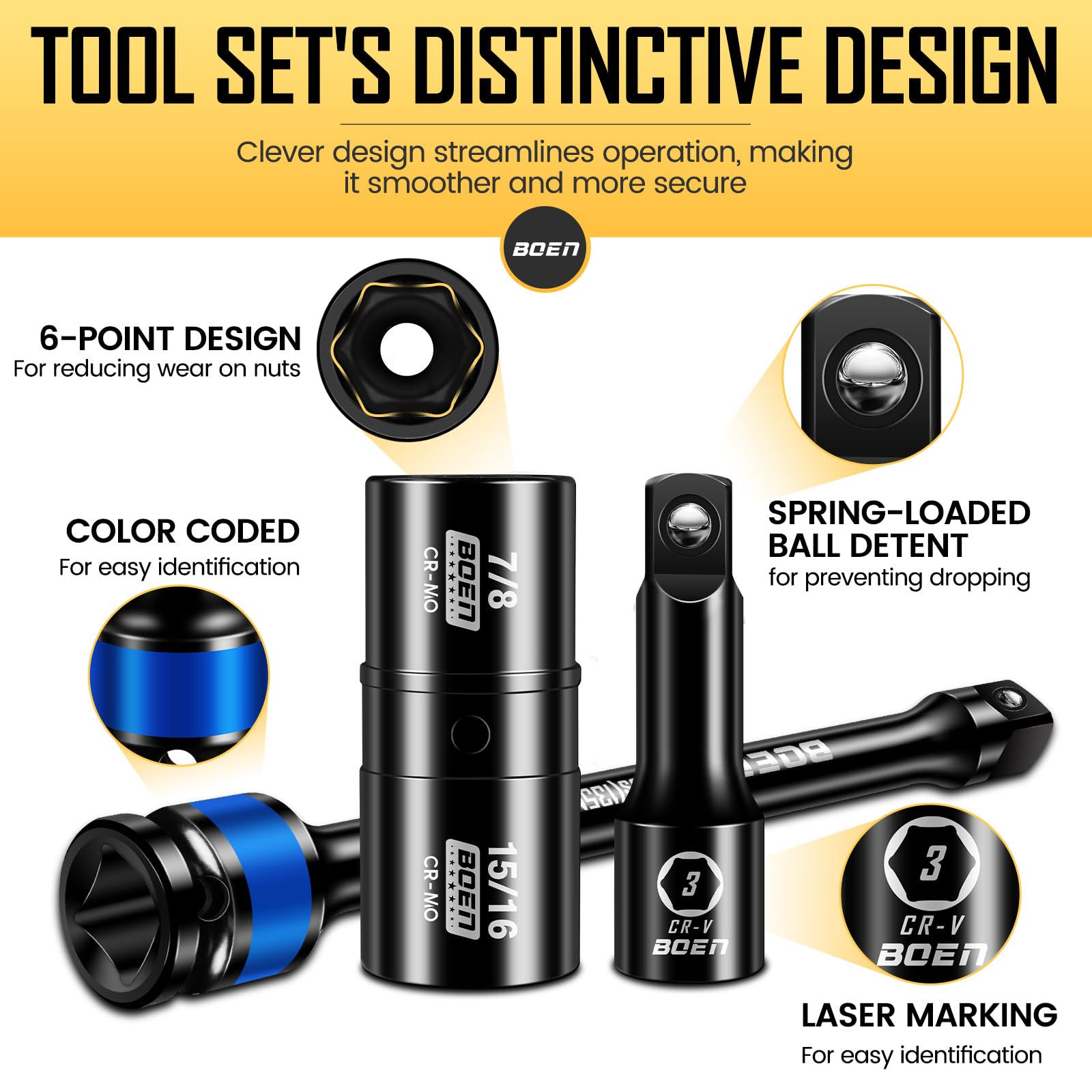 - LASER MARKINGS & COLOR-CODED: Every piece in the BOEN 1/2" drive impact sockets and extensions set features permanent laser markings, while the torque limiting extension bars include color code (red, blue, yellow, gray) for instant recognition. No more fumbling — grab the right tool at a glance, even in low-light environments