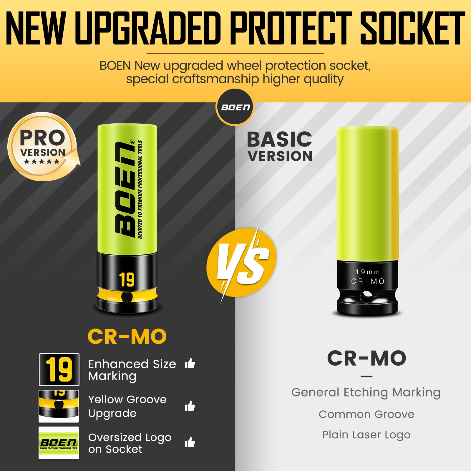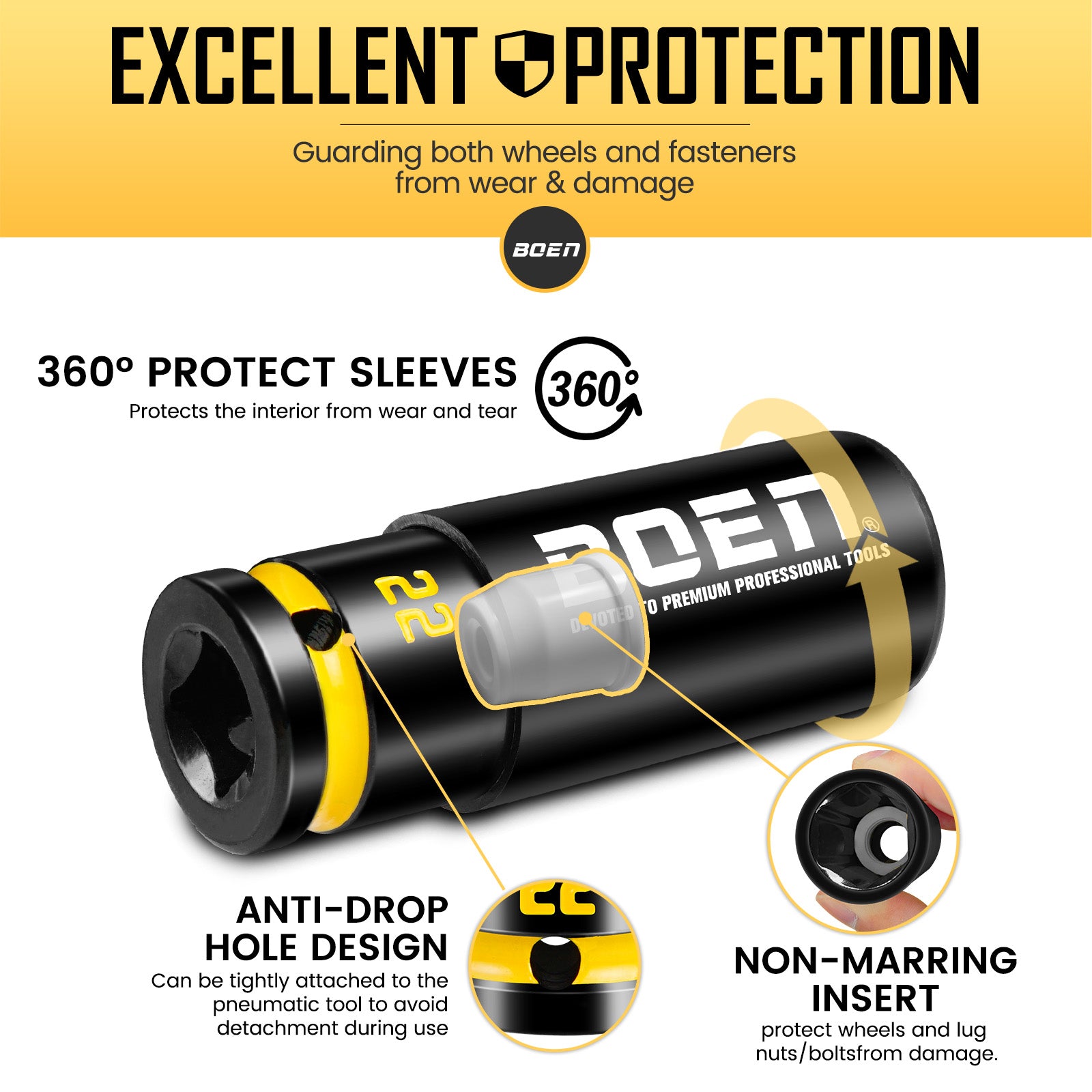 BOEN 1/2" Drive Impact Lug Nut Socket Set, 4 Pieces Non-Marring Thin Wall Wheel Protector Nut Socket, Metric (17, 19, 21, 22) mm, Color-Coded and Embossed and Painted Marking, CR-MO Steel