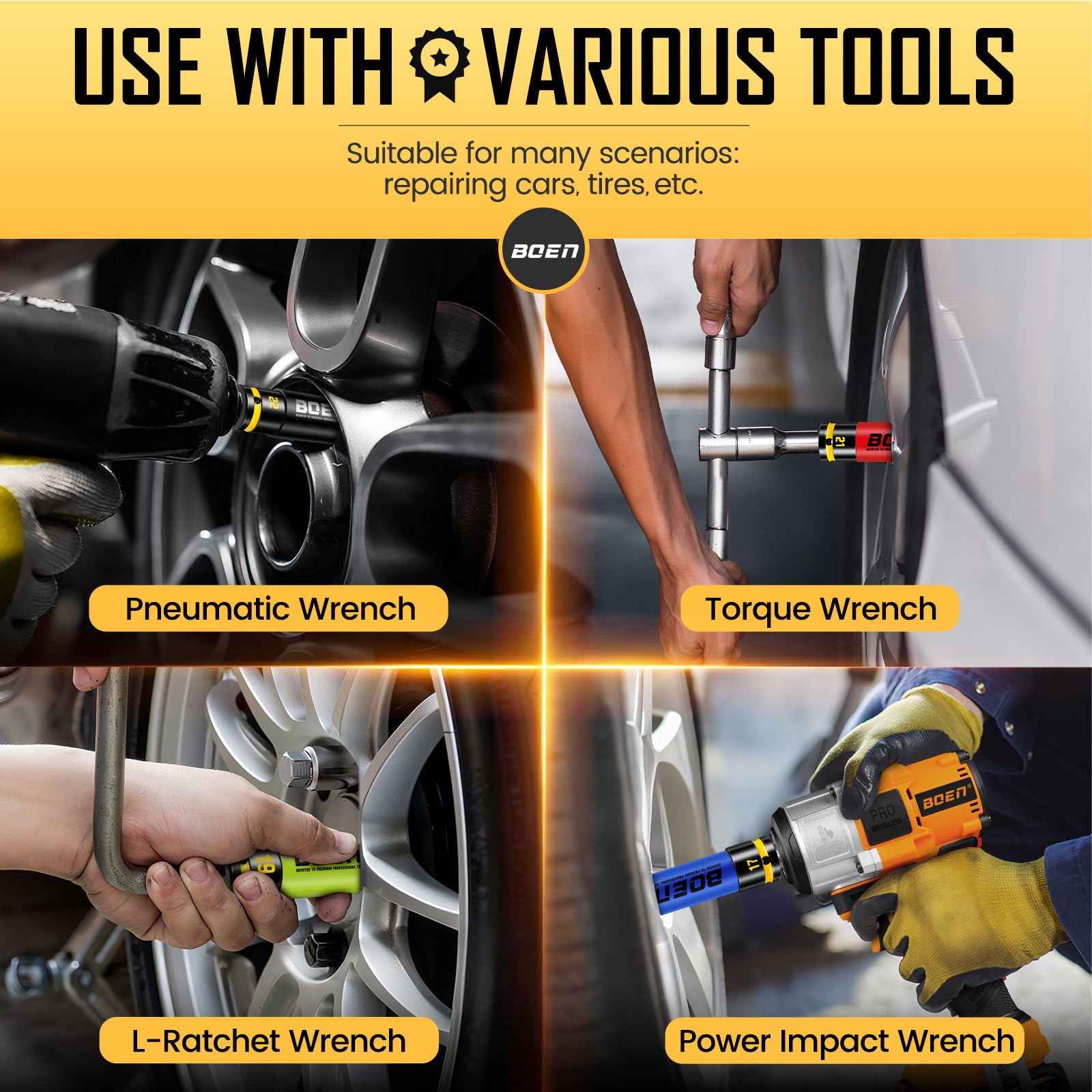 - Cr-Mo Material: The set includes metric sizes: (17mm/blue, 19mm/fluorescent green, 21mm/red, 22mm/black). The set is forged from chromium-molybdenum (Cr-Mo) alloy steel, delivering exceptional strength, wear resistance, and impact toughness. Ideal for heavy-duty applications like automotive maintenance, tire changes, and wheel hub servicing.