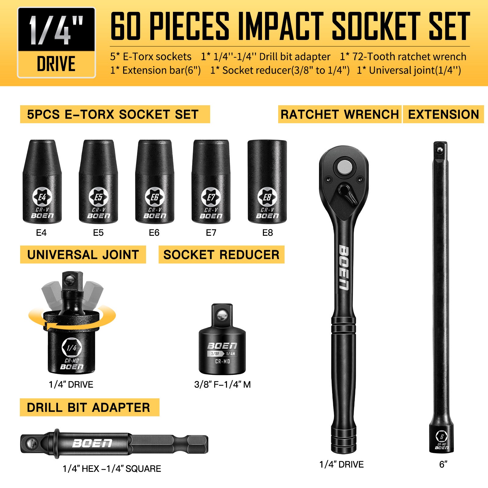 BOEN 1/4" Drive Impact Socket Set, 60-Piece Standard SAE (5/32"-9/16") & Metric (4-15mm), Deep & Shallow Kit, Includes Ratchet Handle,E-torx sockets, Reducer, Extension Bar, Universal Joint