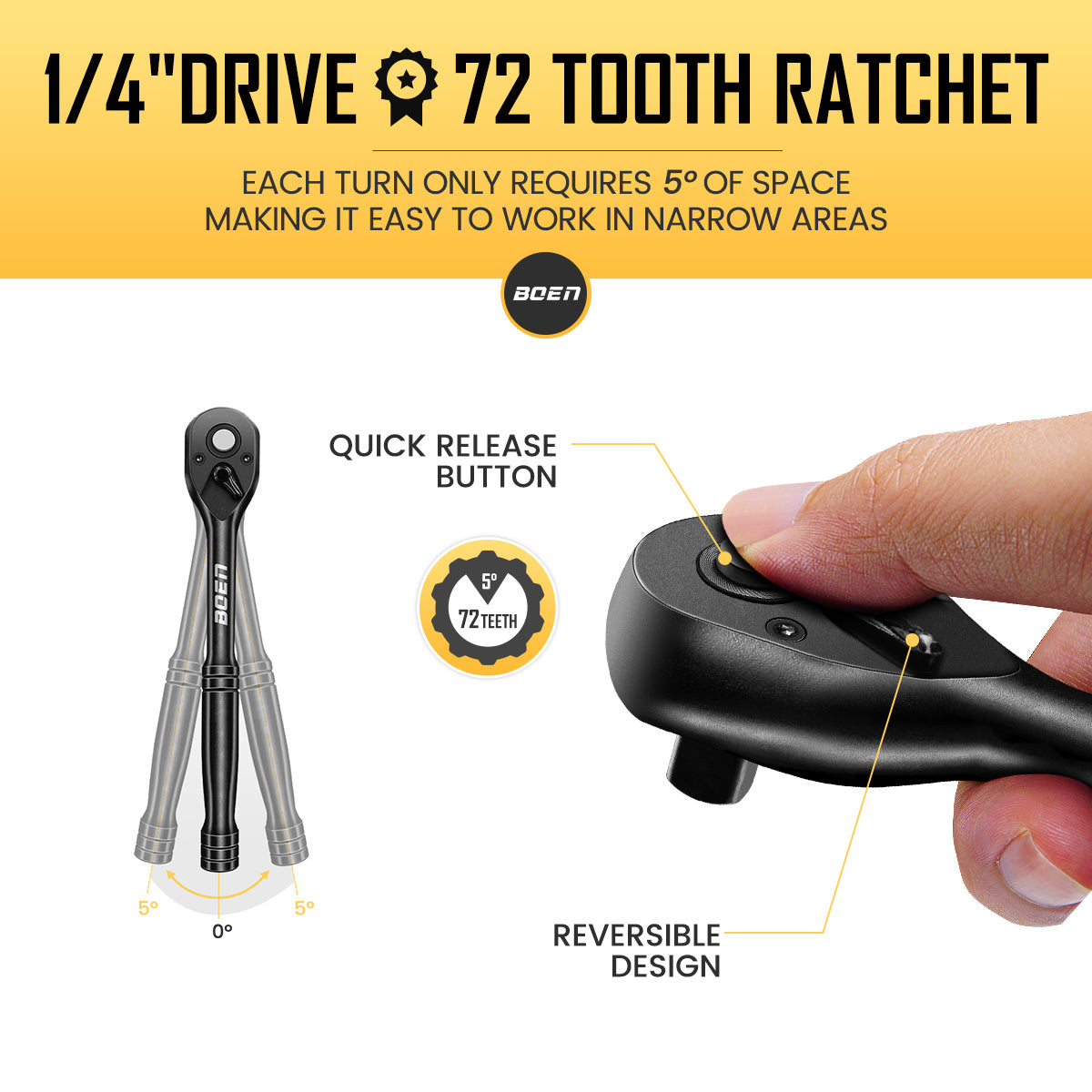 - 【COMPLETE IMPACT SOCKET SET】BOEN 1/4" DRIVE IMPACT SOCKET SET include 28 pcs METRIC deep & shallow sockets: 4-15 mm, 22 pcs SAE deep & shallow sockets: 5/32" - 9/16", 5 pcs e-torx sockets: E4 - E8; 1/4" drive extension bar(6"), 3/8 " F to 1/4 " M impact socket reducer. Additionally, it includes a 1/4" drive impact universal joint and a 1/4" hex - 1/4" square drill bit adapter and the indispensable 72-tooth 1/4" ratchet wrench.