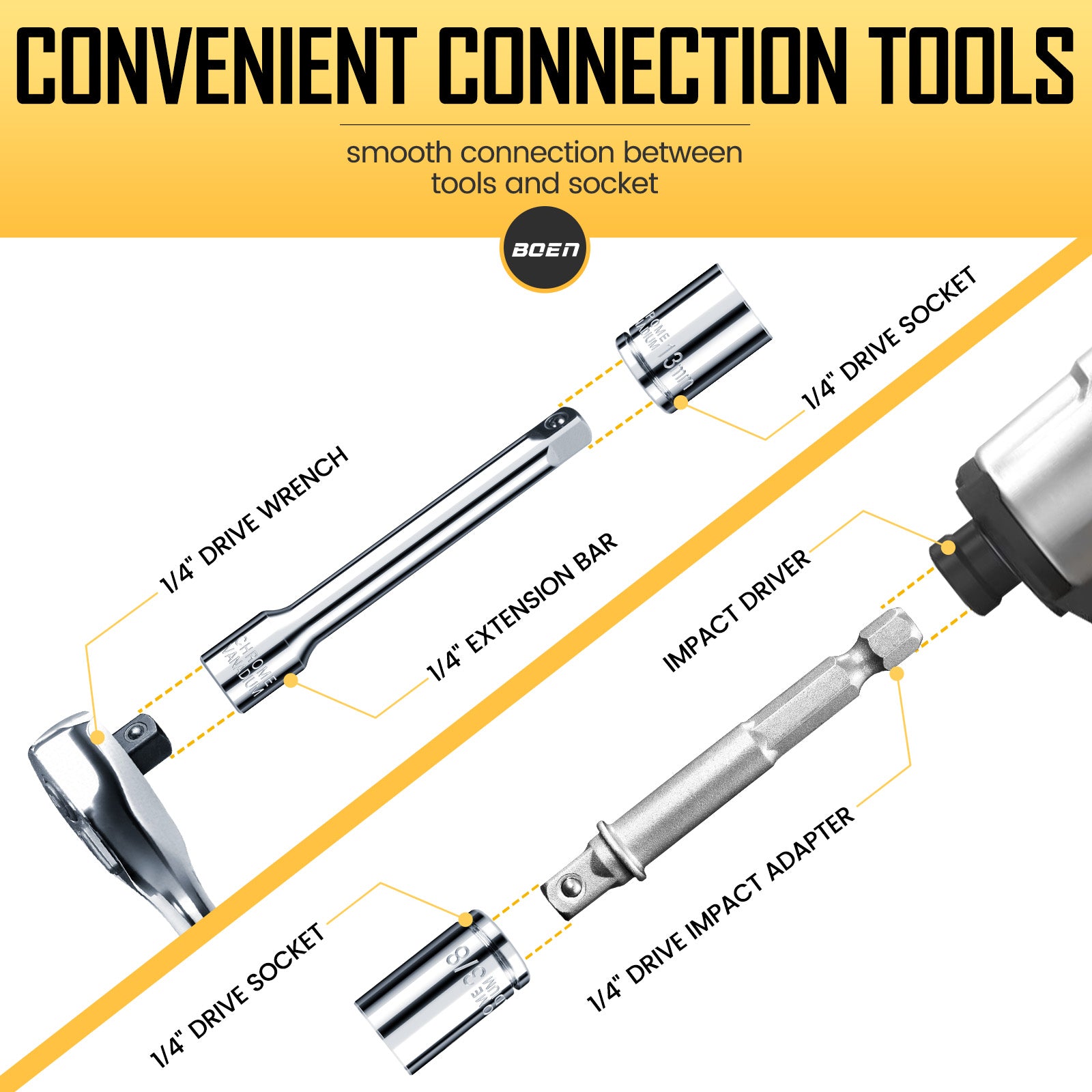 - QUALITY AND SERVICE ASSURANCE: The BOEN impact socket kit complies with ANSI standards. All 1/4" drive socket sets have undergone rigorous testing to ensure optimal performance and durability. If you have any questions, please feel free to contact us at any time