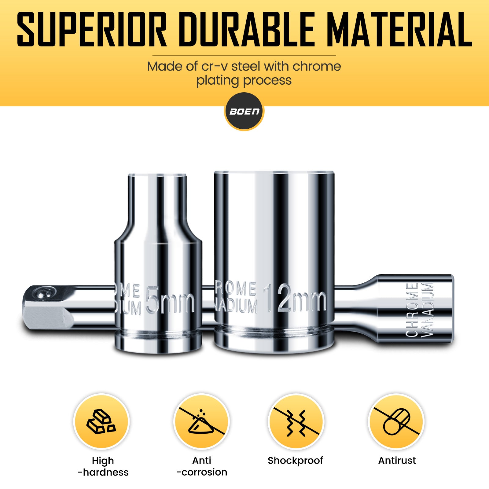 - QUALITY AND SERVICE ASSURANCE: The BOEN impact socket kit complies with ANSI standards. All 1/4" drive socket sets have undergone rigorous testing to ensure optimal performance and durability. If you have any questions, please feel free to contact us at any time