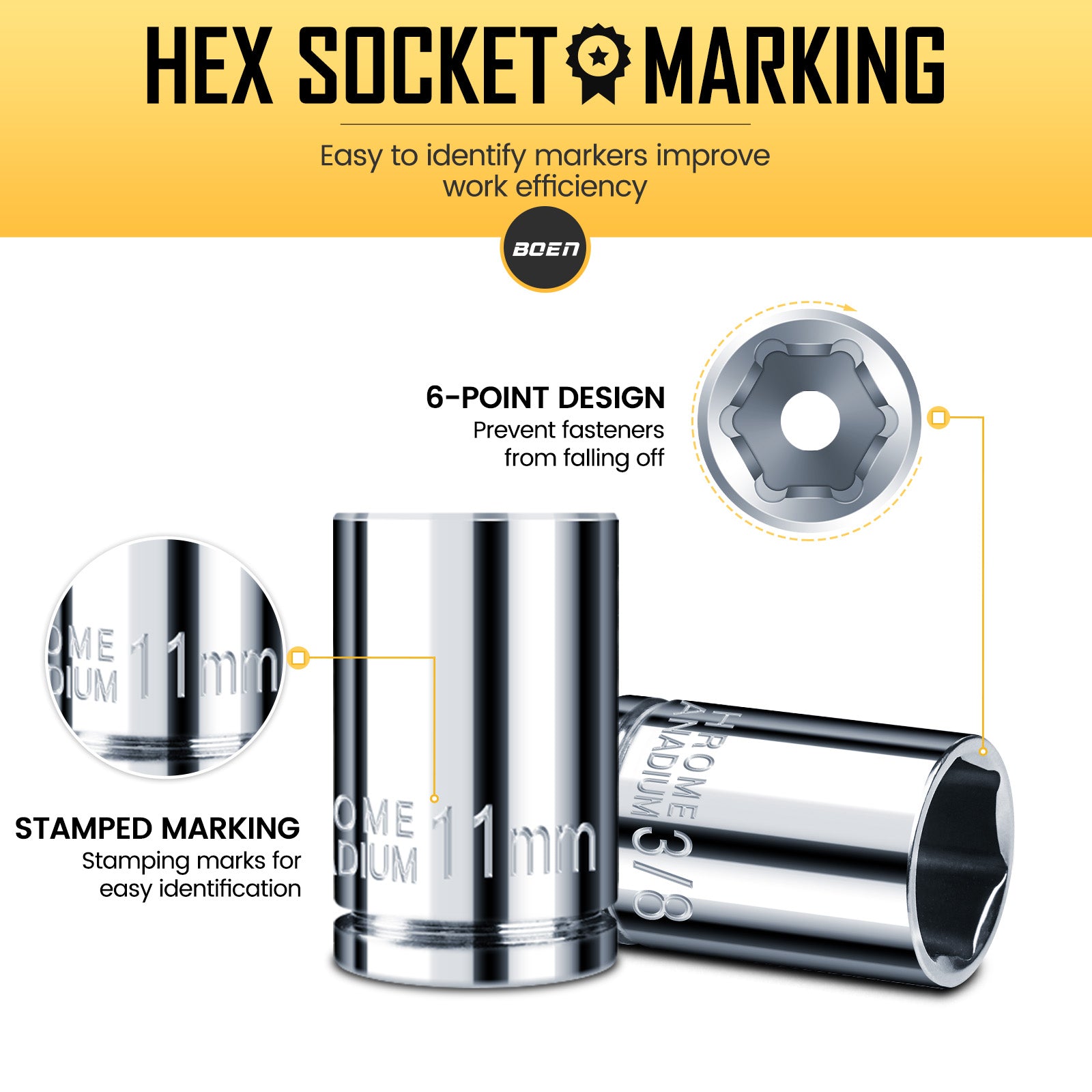 - 6-POINT DESIGN: The socket set adopts a concave 6-point design, which can better grip the fasteners and prevent them from falling off. It also provides a larger surface contact area and torque capability. The square end design is compatible with most ratchet wrenches