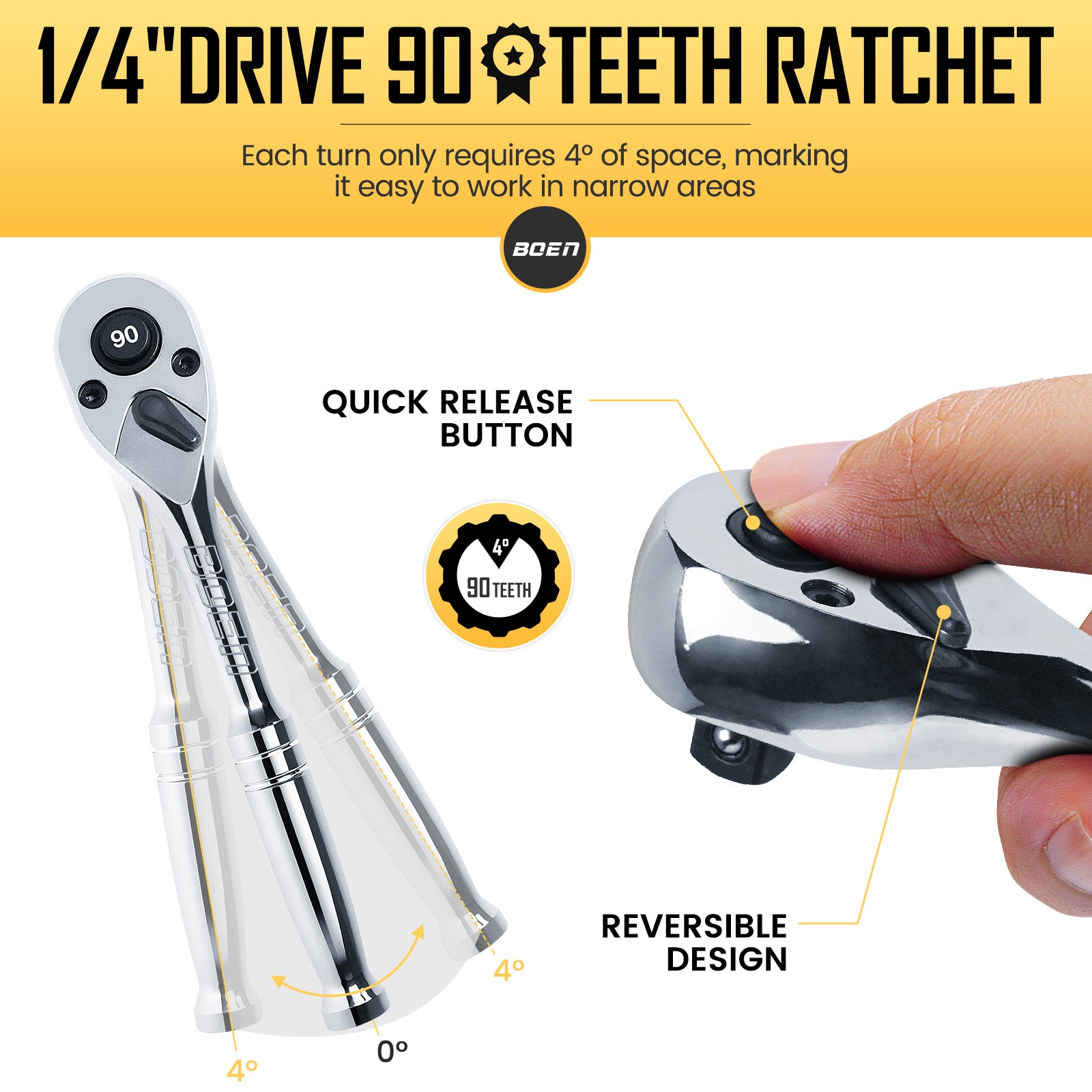 - SET INCLUDE: 1/4” socket set included shallow socket SAE (5/32 "-9/16") and metric (4mm-14mm), 3" extension bar and socket impact adapter, 90 tooth precision ratchet handle (swing angle of 4 °), and is a choice for many auto repair shops, engineering fleets, and DIY workshops
