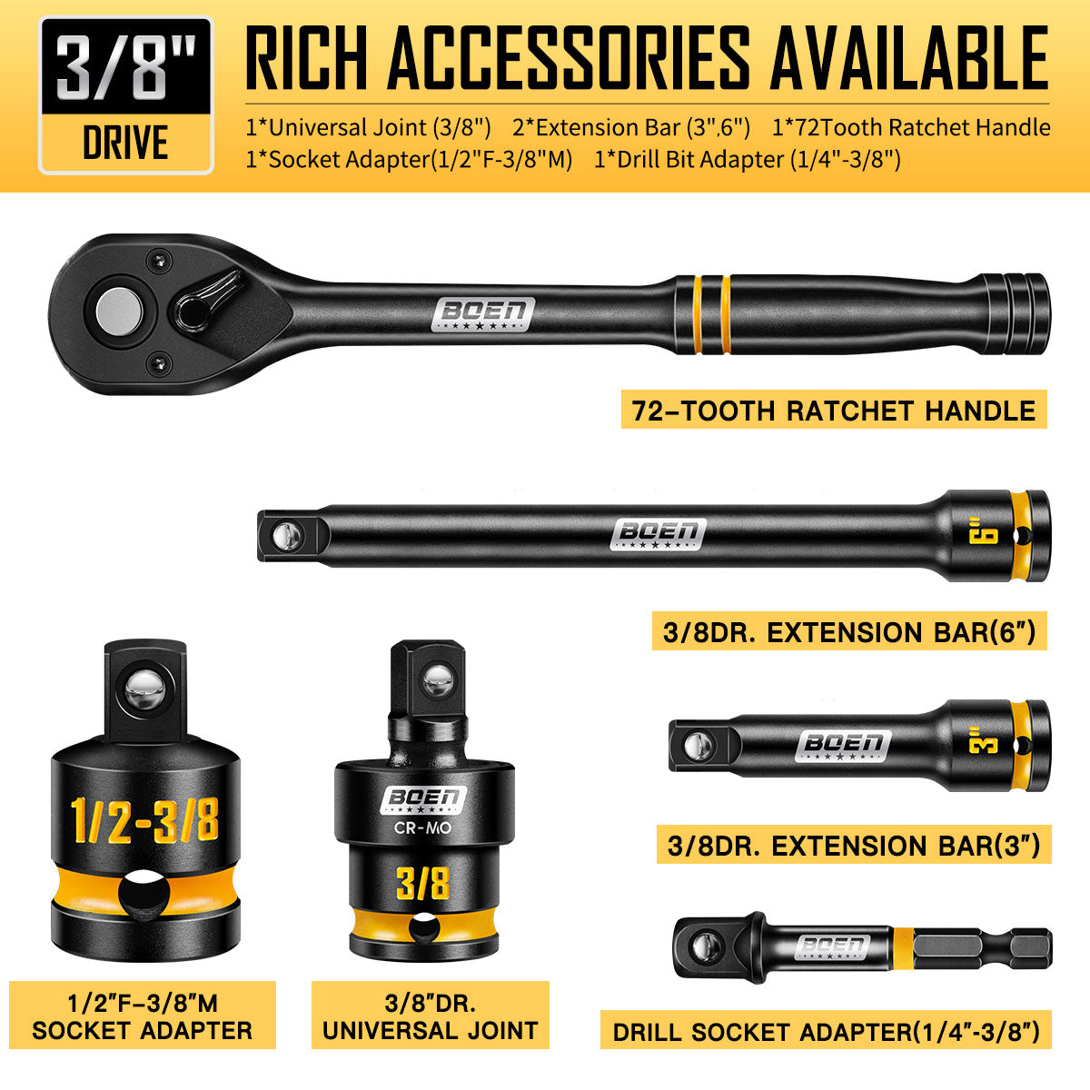 - 3/8" IMPACT SOCKET SET: This 3/8” drive metric socket set includes: 16pcs SAE deep & shallow sockets (5/16, 3/8, 7/16, 1/2, 9/16, 5/8, 11/16, 3/4) and 28pcs metric deep & shallow sockets (8, 9, 10, 11, 12, 13, 14, 15, 16, 17, 18, 19, 21, 22mm); 3" 6"extension bar; 3/8" drive universal joint; 1/4”F - 3/8”M drill socket adapter; 1/2”F - 3/8”M socket adapter; 3/8" ratchet handle. Features a full set of deep& short sockets, it can more easily adapt to various complex maintenance environments