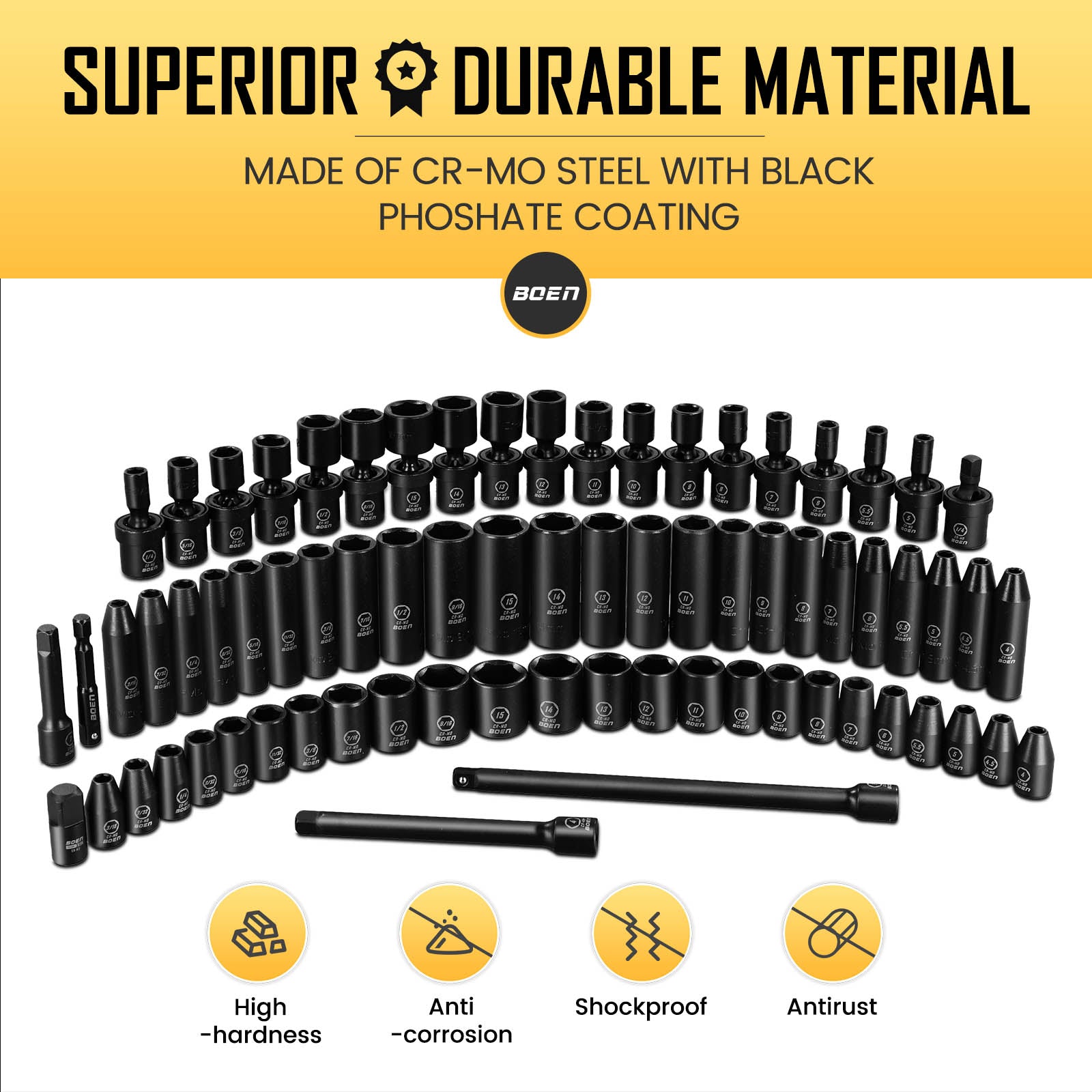 - 【QUALITY】BOEN impact socket set meets ANSI/ASME B107.110-2020 standards for impact sockets, which specify the material strength, torque resistance, and dimensional accuracy required for high-performance sockets. Each socket is made from high-quality CR-MO steel, rigorously tested to ensure it can withstand high-torque applications and perform without failure. The set’s surfaces are treated to resist corrosion and wear, ensuring long-lasting durability. With these industry-standard certifications, you can trust that each socket has passed extensive performance tests and is designed to deliver the best reliability and safety in demanding work environments.