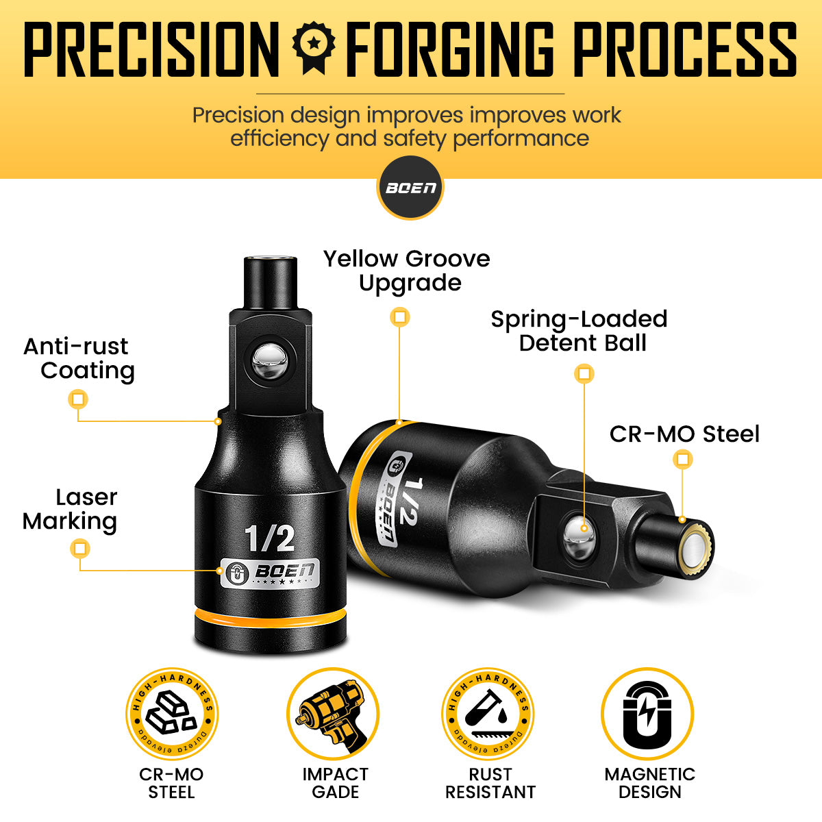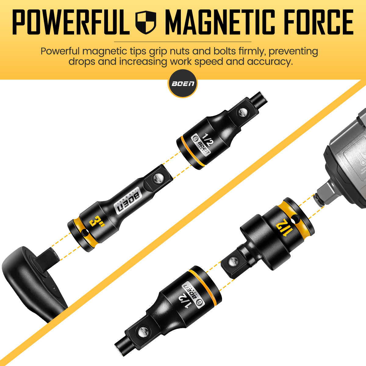 - Convenient Tool: Power through tough jobs with the BOEN 1/2" Drive Magnetic Socket Extension. It allows you to easily tighten screws in tight, deep holes such as inside engines or machinery. Utilizing the magnet at its tip to securely hold bolts and sockets, it effortlessly solves the common problem of parts slipping out and being difficult to install.